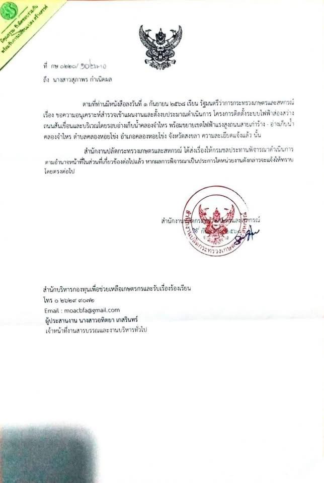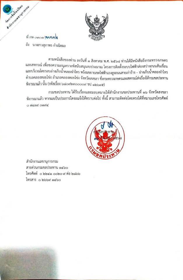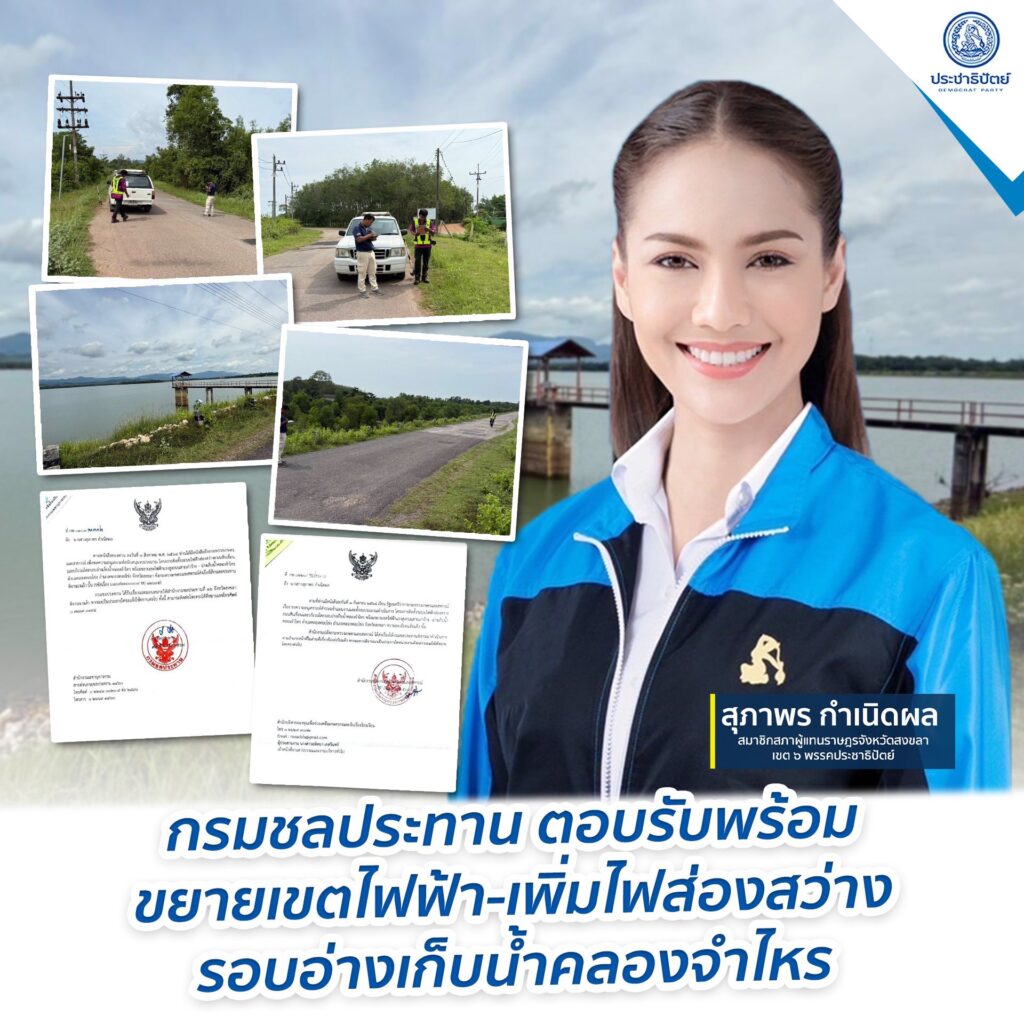 ตามที่ “สส.น้ำหอม” นางสาวสุภาพร กำเนิดผล สมาชิกสภาผู้แทนราษฎรจังหวัดสงขลา พรรคประชาธิปัตย์ ได้รับเรื่องร้องเรียนจากนายภาษิต สุขสันต์ นายกองค์การบริหารส่วนตำบลคลองหอยโข่ง ในการขอให้ประสานหน่วยงานที่เกี่ยวข้องช่วยดำเนินการติดตั้งระบบไฟส่องสว่าง และขยายเขตไฟฟ้าแรงสูงถนนสายเก่าร้าง-อ่างเก็บน้ำคลองจำไหร ต.คลองหอยโข่ง อ.คลองหอยโข่ง จ.สงขลา