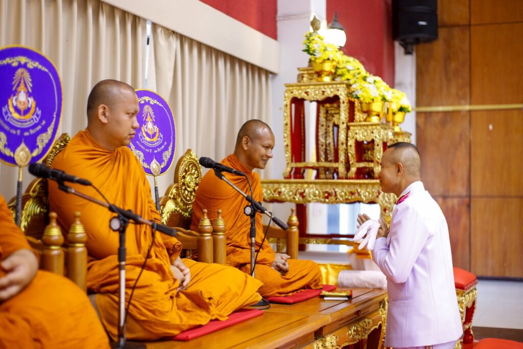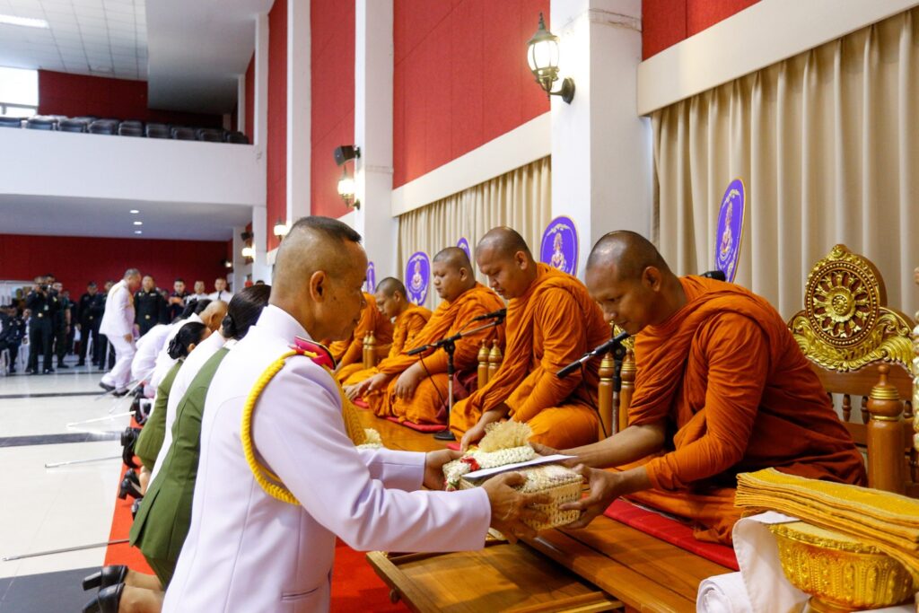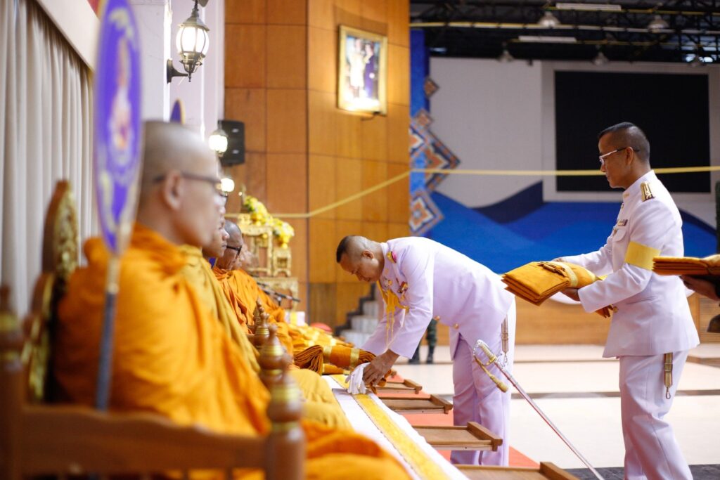พิธีเริ่มต้นด้วย พิธีตักบาตรพระสงฆ์ เพื่อความเป็นสิริมงคล ตามด้วย พิธีวางพวงมาลาและกล่าวน้อมรำลึกในพระมหากรุณาธิคุณ และปิดท้ายด้วย พิธีสวดพระพุทธมนต์ เพื่อแสดงความเคารพอย่างสูงสุดต่อพระองค์ท่าน