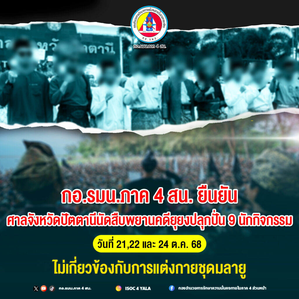 ทั้งนี้ กองอำนวยการรักษาความมั่นคงภายในภาค 4 ส่วนหน้า จึงขอสร้างความเข้าใจกับพี่น้องประชาชนอีกครั้งว่าคดีดังกล่าวเป็น “คดียุยงปลุกปั่น” ที่มีรายละเอียดการปฏิบัติในกิจกรรมอันมีลักษณะขัดต่อกฎหมาย และขอให้ประชาชนตรวจสอบข้อมูลจากแหล่งข่าวที่เชื่อถือได้ และไม่หลงเชื่อข้อมูลบิดเบือนที่อาจสร้างความสับสนในสังคม