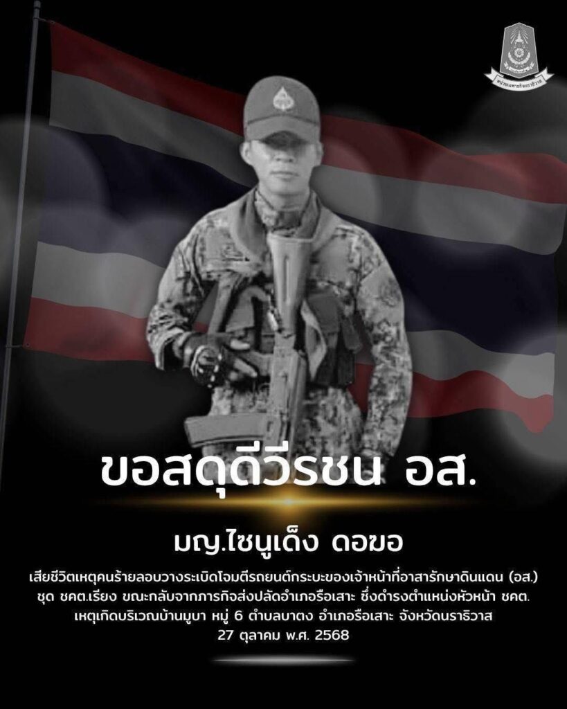 วันนี้(27 ตุลาคม 2568) เวลาประมาณ 15.30 น. เกิดเหตุคนร้ายลอบวางระเบิดรถยนต์เจ้าหน้าที่อาสาสมัครชุดคุ้มครองตำบลเรียง ซึ่งเป็นอาสาสมัครประจำพื้นที่ ที่ดูแลความปลอดภัยและความเรียบร้อยให้กับพี่น้องประชาชน โดยขณะเดินทางกลับหลังจากเดินทางไปส่งปลัดอำเภอรือเสาะ (หัวหน้าชุดคุ้มครองตำบลเรียง) ณ ที่ว่าการอำเภอรือเสาะ จังหวัดนราธิวาส เมื่อเดินทางมาถึงถนนบริเวณพื้นที่ หมู่ที่ 6 ตำบลบางตง อำเภอรือเสาะ จังหวัดนราธิวาส เกิดเหตุระเบิดต่อรถยนต์เจ้าหน้าที่ เป็นเหตุให้ นายหมู่ใหญ่ ไซนูเดน ดอฆอ เจ้าหน้าที่อาสาสมัครชุดคุ้มครองตำบลเรียง เสียชีวิตในที่เกิดเหตุทันที