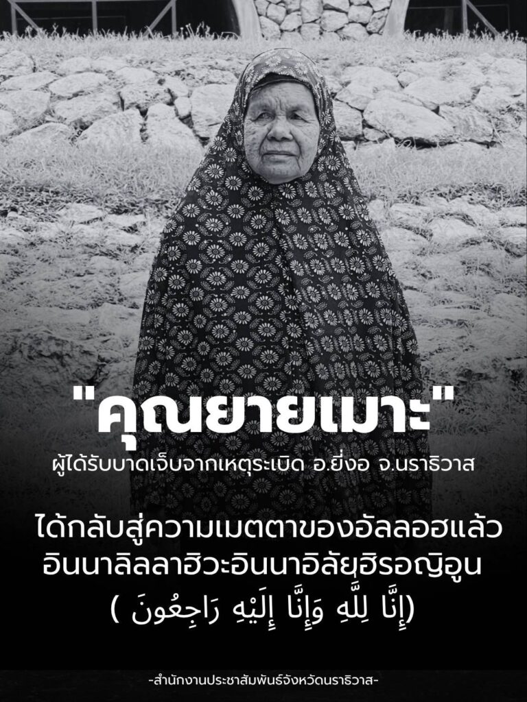 “คุณยายเมาะ” นางสาวรอเมาะ ตาเลงปะลา ผู้ได้รับบาดเจ็บจากเหตุคนร้ายลอบวางระเบิด อ.ยี่งอ จ.นราธิวาส เมื่อวันที่ 16 ต.ค. 2568 ได้กลับสู่ความเมตตาของอัลลอฮแล้ว เมื่อเวลา 06.30 น. วันนี้ (18 ตุลาคม 2568) ที่โรงพยาบาลนราธิวาสราชนครินทร์ แพทย์ได้ผ่าตัดช่วยชีวิต อย่างเต็มที่ แต่ด้วยเมาะอายุมาก ประกอบกับบาดแผลที่โดนสะเก็ดระเบิดเข้าจุดสำคัญ สุดท้ายเมาะได้จากไปอย่างสงบ อินนาลิลลาฮิวะอินนาอิลัยฮิรอญิอูน ( إِنَّا لِلَّٰهِ وَإِنَّا إِلَيْهِ رَاجِعُونَ) “แท้จริงพวกเราเป็นกรรมสิทธิ์ของอัลลอฮ์ และแท้จริงพวกเราจะกลับไปยังพระองค์”นี่คือ..ประชาชนผู้บริสุทธิ์ที่ต้องจากไปกับการกระทำอันโหดร้ายของผู้ก่อเหตุรุนแรงในพื้นที่จังหวัดชายแดนภาคใต้ เราขอแสดงความเสียใจกับญาติและครอบครัวของเมาะ มา ณ ที่นี้กำหนดการพิธีฝังศพ น.ส.รอเมาะ ตาเลงปะลา อายุ 79 ปี จัดในวันนี้ (18 ต.ค. 68) เวลาประมาณ 13.00 น. ณ กุโบร์มัสยิดอีเดาะห์ ม.4 ต.ยี่งอ อ.ยี่งอ จ.นราธิวาส