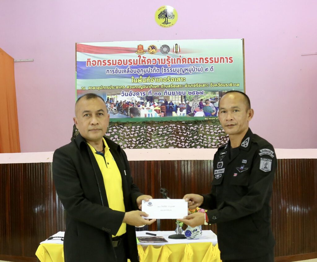 วันที่ 10 กันยายน 2567 เวลา 09.30 น. ณ ศาลาอุปการประชากร สวนกาญจนาภิเษก ตำบลรือเสาะ อำเภอรือเสาะ จังหวัดนราธิวาส พันเอก นพดล พรหมมาก รองผู้บังคับหน่วยเฉพาะกิจกรมทหารพรานที่ 46 ให้การต้อนรับ พันเอก ปฐพี พุทธผล ผู้อำนวยการกองสันติวิธี ศูนย์สันติวิธี (ผอ.กสธ.ศสว.) ซึ่งให้เกียรติมาเป็นวิทยากรบรรยายพิเศษ ในหัวข้อ “การขับเคลื่อนธรรมนูญหมู่บ้าน 9 ดี (ฮูกุมปากัต) และการสร้างความเข้าใจแนวทางการปลูกฝังยะกีน” ให้กับส่วนราชการ, ชุดปฏิบัติการกิจการพลเรือนของหน่วย, ประธานคณะกรรมการหมู่บ้าน, กรรมการหมู่บ้าน และผู้นำศาสนาในพื้นที่ อำเภอรือเสาะ จังหวัดนราธิวาส