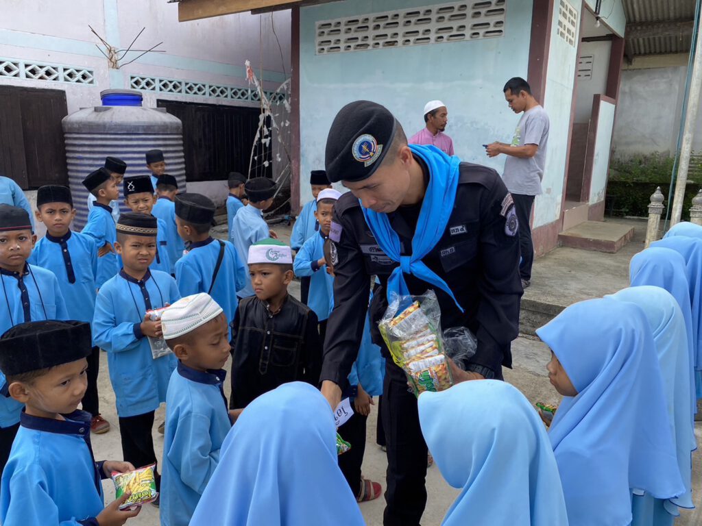 เมื่อ 14 กันยายน 2567 เวลา 08.00 น. พันเอก ภาณุวัฒน์ สุคชเดช ผู้บังคับหน่วยเฉพาะกิจกรมทหารพรานที่ 49 มอบหมายให้ ร้อยโท กิตติ เกื้อเพชร ผู้บังคับกองร้อยทหารพรานที่ 4914 พร้อมด้วย จ่าสิบเอก ปริวัฒน์ ชูโต รองหัวหน้าชุดปฏิบัติการกิจการพลเรือน และกำลังพลชุดปฏิบัติการกิจการพลเรือน เข้าพบปะ พัฒนาสัมพันธ์ครูผู้สอนศาสนาและนักเรียนในตาดีกา และร่วมกิจกรรมเสาธง 5 นาที ได้ให้ความรู้กับนักเรียนเกี่ยวกับโทษของยาเสพติด พร้อมทั้งมอบธงชาติผืนใหม่ให้กับศูนย์การศึกษาอิสลามประจำมัสยิดฯ โดยเปลี่ยนธงชาติผืนเก่าที่มีสีซีดให้เป็นธงชาติผืนใหม่สีสดใส