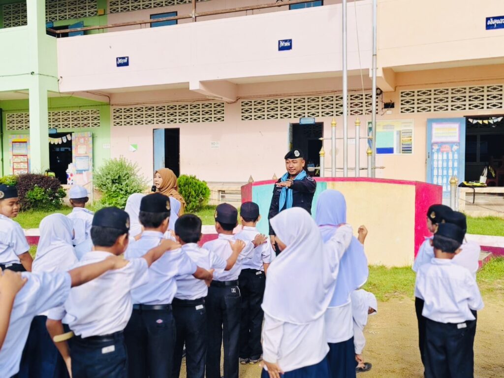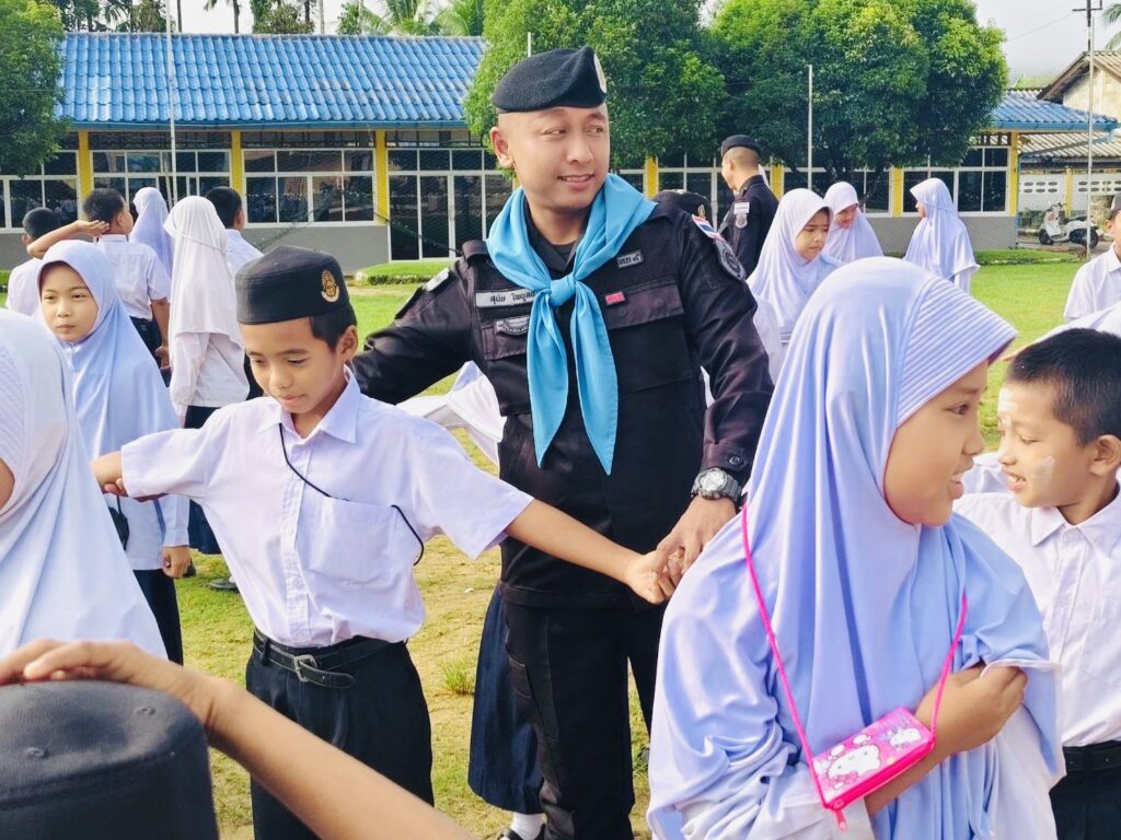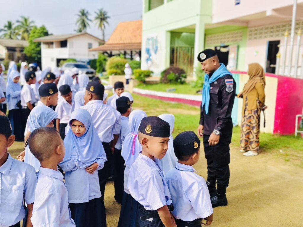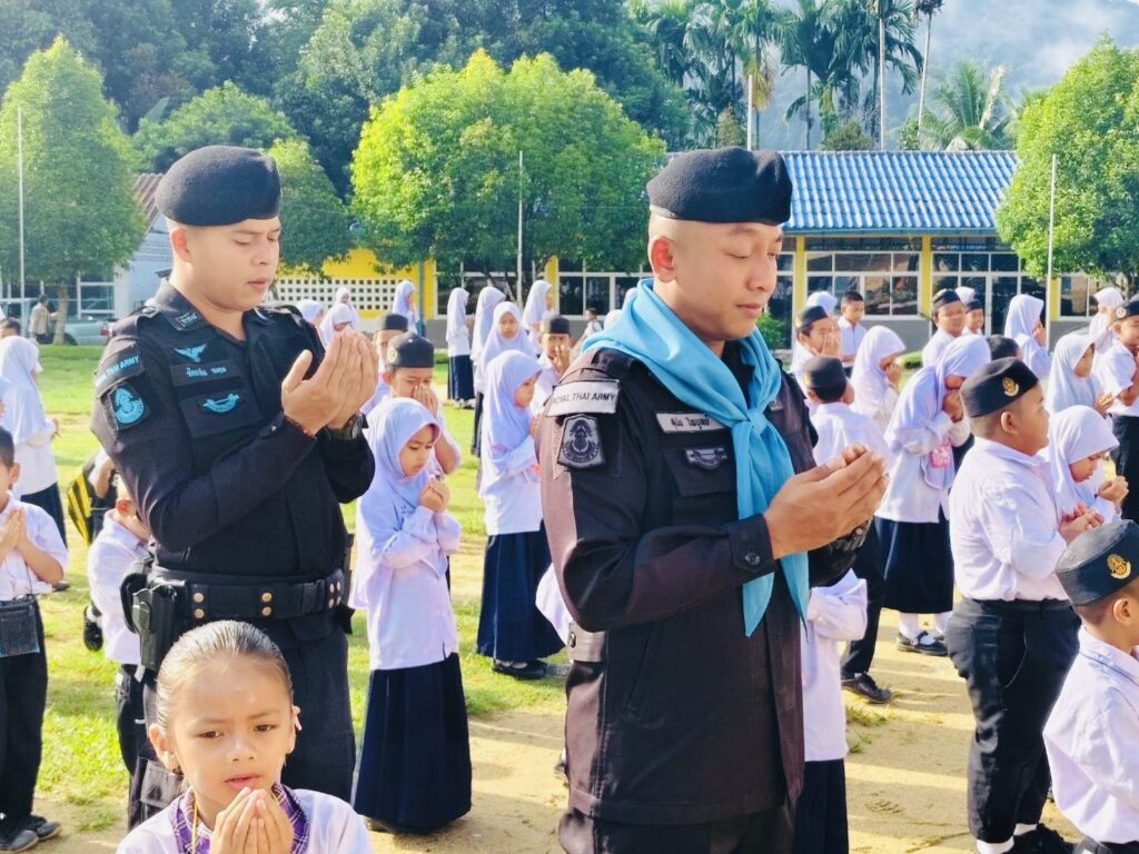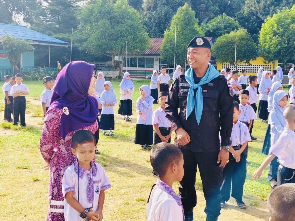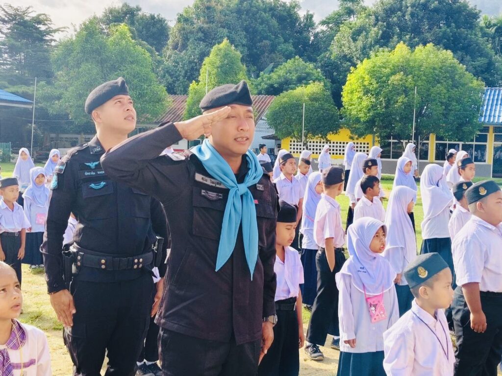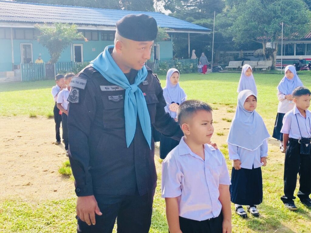 วันที่ 3 พฤศจิกายน 2568 เวลา 08.00 น. พันเอก ณัฏฐพล สุนทรนนท์ ผู้บังคับหน่วยเฉพาะกิจกรมทหารพรานที่ 49 มอบหมายให้ กองร้อยทหารพรานที่ 4912 นำโดย จ่าสิบเอก สุนัย ไพบูลย์ หัวหน้าส่วนการเมืองชุดปฏิบัติการกิจการพลเรือนที่ 4912 พร้อมด้วย กำลังพลชุดปฏิบัติการกิจการพลเรือน ร่วมทำกิจกรรมเสาธง 5 นาที นำนักเรียนร้องเพลงชาติ เชิญธงชาติขึ้นสู่ยอดเสา เพื่อปลุกจิตสำนึกให้เด็ก เยาวชน รู้คุณชาติ ศาสนา พระมหากษัตริย์ ปฏิบัติตนอยู่ในกรอบของกฎหมาย ยึดหลัก “ความสงบ และรู้ รัก สามัคคี” ตลอดจนปกป้องชาติ ศาสนา พระมหากษัตริย์ ให้สามสถาบันหลักของชาติเป็นศูนย์รวมจิตใจของปวงชนในชาติ และสามารถดำรงอยู่คู่กับประชาธิปไตยอย่างมั่นคงต่อไป พร้อมปลูกฝังอุดมการณ์ความรักชาติ และสร้างความรู้เรื่องโทษของยาเสพติด ทั้งนี้เพื่อเสริมสร้างความสัมพันธ์ที่ดีระหว่างเจ้าหน้าที่รัฐกับสถานศึกษา ณ โรงเรียนบ้านดาฮง หมู่ที่ 4 ตำบลเชิงคีรี อําเภอศรีสาคร จังหวัดนราธิวาส