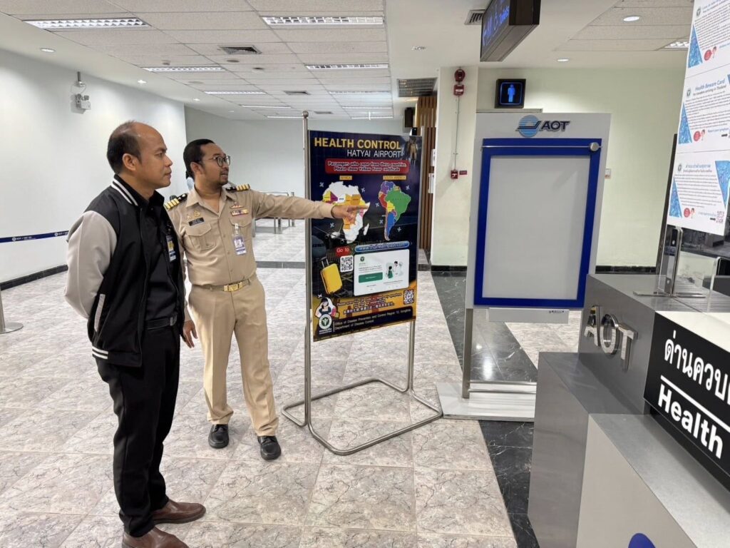 วันที่ 27 มกราคม 2569 นายกฤษฎา พุกะทรัพย์ ผู้อำนวยการท่าอากาศยานหาดใหญ่ (ผหญ.) พร้อมด้วยผู้บริหารท่าอากาศยานหาดใหญ่ ลงพื้นที่ห้องผู้โดยสารขาเข้าระหว่างประเทศ ทหญ. เพื่อตรวจเยี่ยมการปฏิบัติงานของด่านควบคุมโรคติดต่อระหว่างประเทศท่าอากาศยานหาดใหญ่ ในการคัดกรองโรคติดเชื้อไวรัสนิปาห์