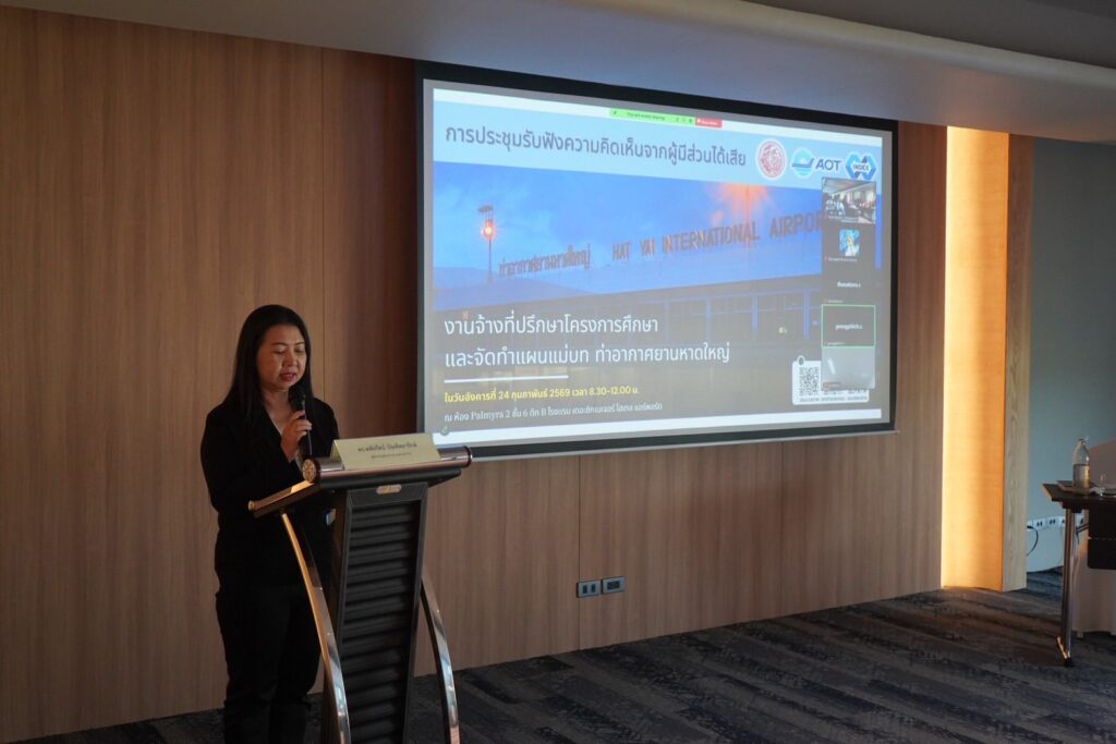 วันที่ 24 กุมภาพันธ์ 2569 (เวลา 08.00 น.) นายกฤษฎา พุกะทรัพย์ ผู้อำนวยการท่าอากาศยานหาดใหญ่ เป็นประธานการประชุมรับฟังความคิดเห็นจากผู้มีส่วนได้เสีย ตามที่ บริษัท ท่าอากาศยานไทย จำกัด (มหาชน) (ทอท.) ได้ว่าจ้างบริษัท อินเด็กซ์ อินเตอร์เนชั่นแนล กรุ๊ป จำกัด (มหาชน) เป็นผู้ให้บริการงานจ้างที่ปรึกษาเพื่อศึกษาและจัดทำแผนแม่บทท่าอากาศยานหาดใหญ่ โดยมีวัตถุประสงค์เพื่อศึกษาแนวทางการพัฒนา ทหญ. ให้สามารถคงสถานะในการเป็นศูนย์กลางการบินในท้องถิ่น สอดคล้องกับปัจจัยการดำเนินงานและปริมาณการจราจรทางอากาศที่เปลี่ยนแปลงไป และสอดคล้องกับบทบาทตามนโยบายของรัฐบาล