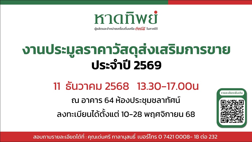 บริษัท หาดทิพย์ จำกัด (มหาชน) เปิดรับสมัครผู้เข้าร่วมประมูลราคาวัสดุส่งเสริมการขายและผู้รับซื้อเศษวัสดุ ประจำปี 2569 โดยมีคุณสมบัติดังนี้