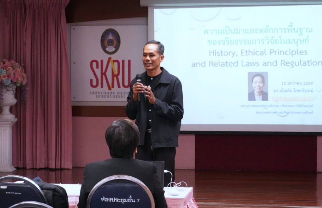 เมื่อวันที่ 15-16 มกราคม 2569 สถาบันวิจัยและพัฒนา มหาวิทยาลัยราชภัฏสงขลา (มรภ.สงขลา) จัดโครงการอบรมเชิงปฏิบัติการ เรื่อง “จริยธรรมการวิจัยในมนุษย์” ณ ห้องประชุม IRD.L ชั้น 1 สถาบันวิจัยและพัฒนา โดยมี อาจารย์พุฒิธร ตุกเตียน ผู้อำนวยการสถาบันวิจัยและพัฒนา มรภ.สงขลา กล่าวเปิดการอบรม และกล่าวรายงานโดย อาจารย์ ดร.เพชร รองพล รองผู้อำนวยการฝ่ายบริหารจัดการนวัตกรรมและกิจการพิเศษ วัตถุประสงค์เพื่อให้ผู้เข้าร่วมอบรมมีความรู้ความเข้าใจหลักจริยธรรมการวิจัยในมนุษย์ และทราบวิธีปฏิบัติในการเสนอโครงการวิจัยเพื่อขอรับการพิจารณารับรองจริยธรรมการวิจัยในมนุษย์