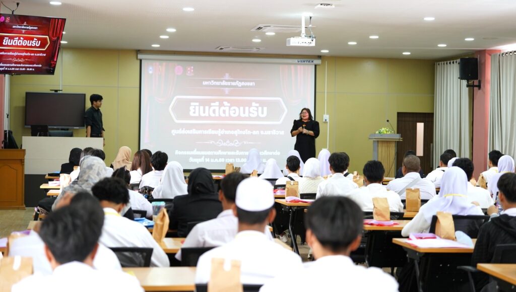 เมื่อวันที่ 14 มกราคม 2569 ผศ.พิเชษฐ์ จันทวี อธิการบดีมหาวิทยาลัยราชภัฏสงขลา (มรภ.สงขลา) มอบหมายให้ สำนักส่งเสริมวิชาการและงานทะเบียน มหาวิทยาลัยราชภัฏสงขลา (มรภ.สงขลา) นำโดย อาจารย์เอมอร อ่าวสกุล ผู้อำนวยการ พร้อมทีมบริหารและบุคลากร ให้การต้อนรับคณะครูและนักเรียนจากศูนย์ส่งเสริมการเรียนรู้ระดับอำเภอสุไหงโก-ลก (สกร.อ.สุไหงโก-ลก) และ ศูนย์ส่งเสริมการเรียนรู้ระดับอำเภอตากใบ (สกร.อ.ตากใบ) จังหวัดนราธิวาส ในโอกาสเดินทางมาเยี่ยมชมสถานศึกษาและรับฟังการแนะแนวการศึกษาต่อ