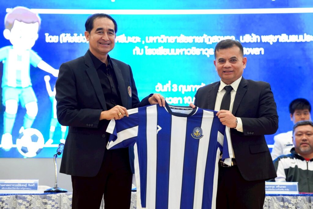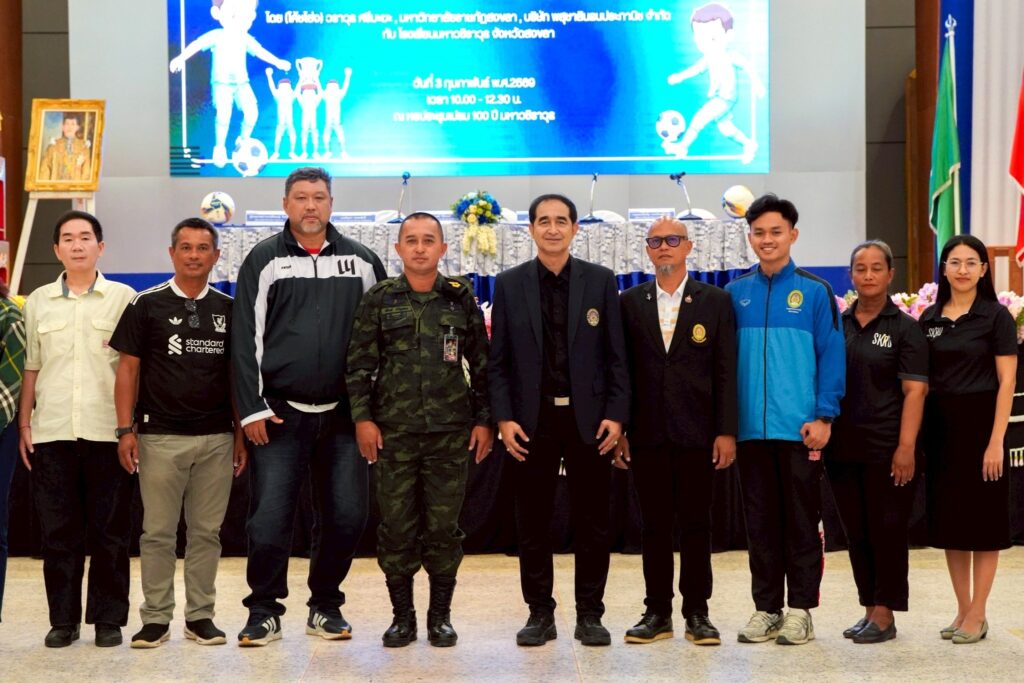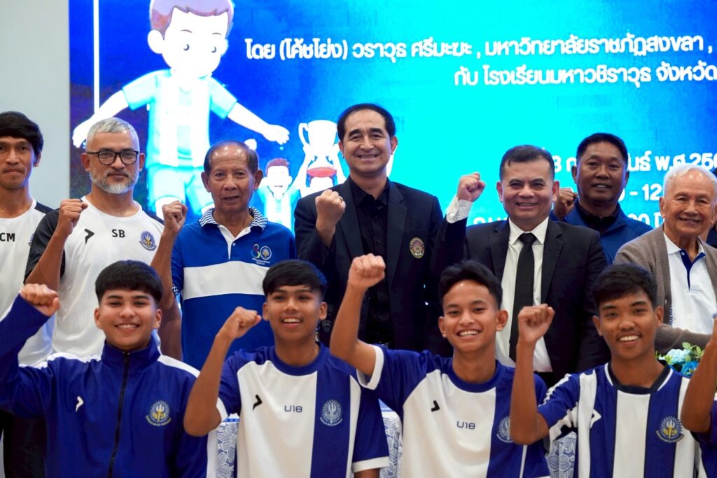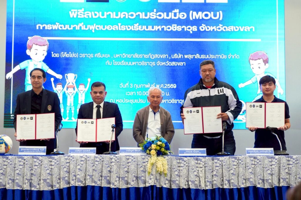 มรภ.สงขลา ลงนามความร่วมมือโรงเรียนมหาวชิราวุธ “โค้ชโย่ง” วรวุธ ศรีมะฆะ จาก บ.นัมเบอร์โฟร์ทีนฯ และ บ.พสุชาสินธนประภานิชฯ ผนึกกำลังพัฒนาทีมฟุตบอลชุด U 14 , 16 และ 18 ปี ปูทางสู่ความเป็นเลิศระดับประเทศและระดับนานาชาติ พร้อมเปิดโอกาสให้นักกีฬาฟุตบอลที่มีคุณสมบัติ เข้าศึกษาต่อระดับปริญญาตรีในมหาวิทยาลัย ภายใต้การบริการวิชาการเพื่อพัฒนาการเรียนการสอน การวิจัย การยกระดับคุณภาพชีวิตและสังคม และการเพิ่มขีดสามารถในการแข่งขัน