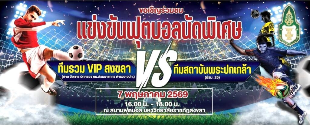 มหาวิทยาลัยราชภัฏสงขลา (มรภ.สงขลา) เปิดสนามต้อนรับการแข่งขันฟุตบอลกระชับมิตรแมตซ์สำคัญ ระหว่างทีมรวม VIP สงขลา (ศาล อัยการ ปกครอง หัวหน้าส่วนราชการ ตำรวจ อปท.) vs ทีมสถาบันพระปกเกล้า (ปรม.25) รับชมและเชียร์การลงสนามดวลแข้งนัดพิเศษพร้อมกันในวันพฤหัสบดีที่ 7 พฤษภาคม 2569 ตั้งแต่เวลา 16.00 น. เป็นต้นไป ณ สนามฟุตบอล มรภ.สงขลา