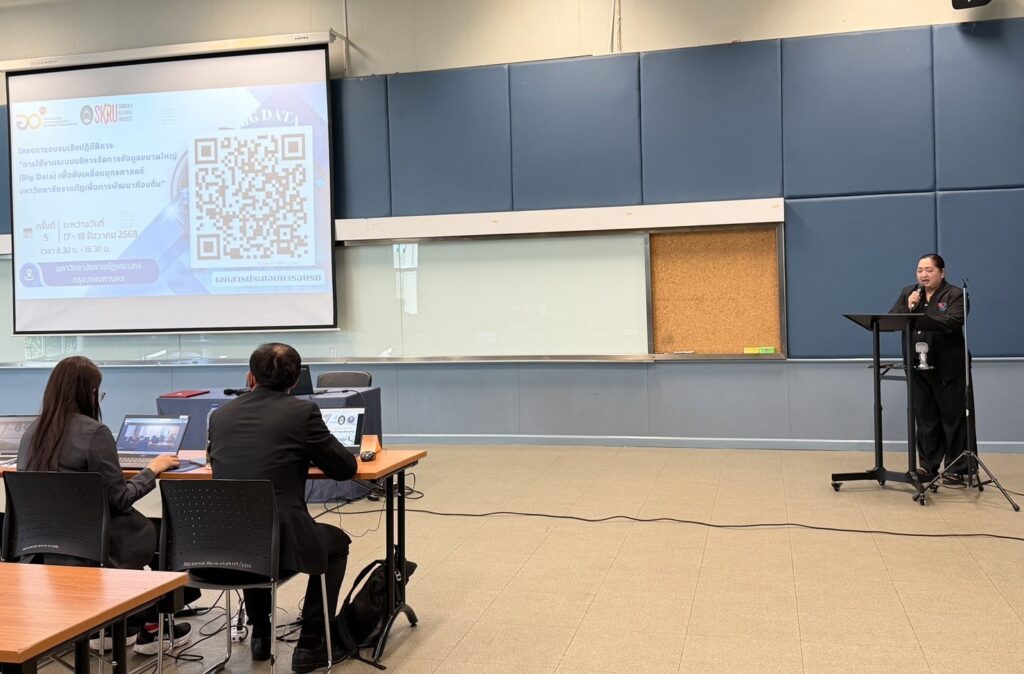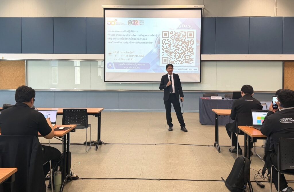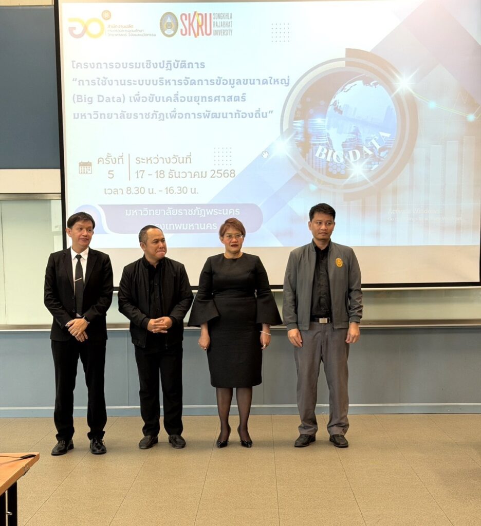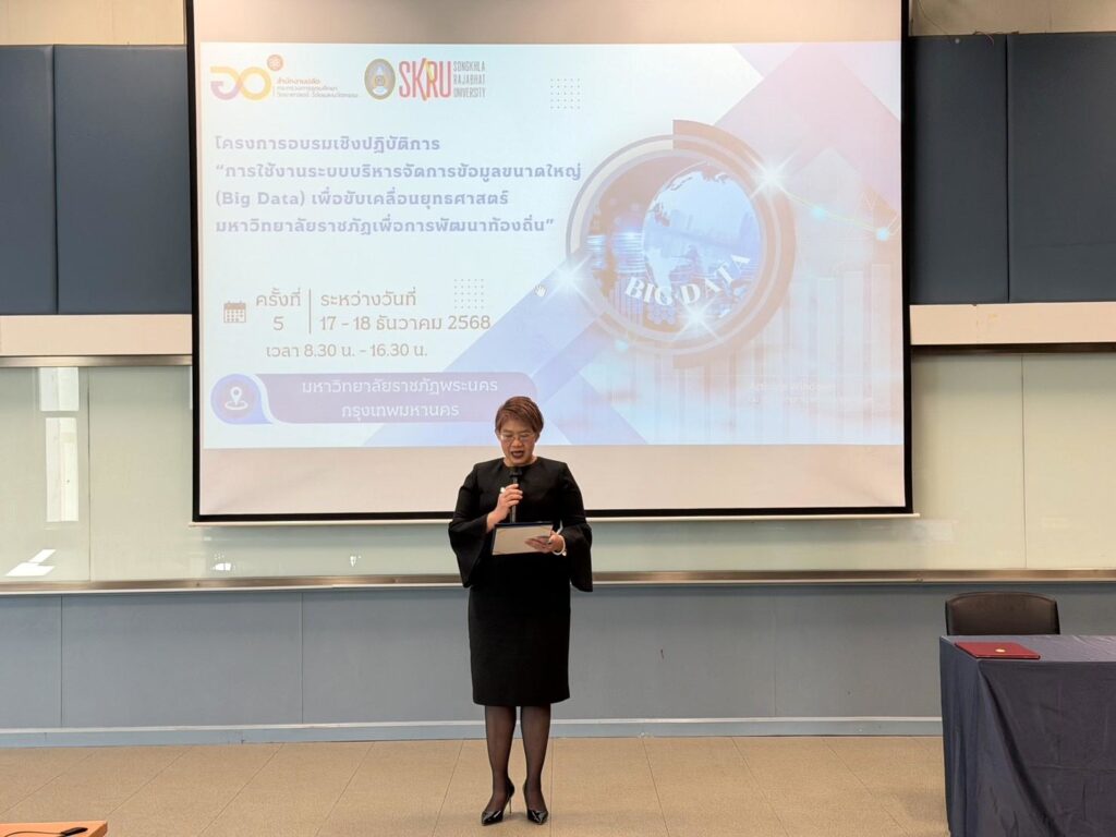 ผศ.พิเชษฐ์ จันทวี อธิการบดีมหาวิทยาลัยราชภัฏสงขลา (มรภ.สงขลา) มอบหมายให้บุคลากรงานนโยบายและยุทธศาสตร์ กองนโยบายและแผน สำนักงานอธิการบดี มรภ.สงขลา ประกอบด้วย นางสโรชา บริสุทธิ์ นักวิเคราะห์นโยบายและแผนชำนาญการ นางกฤชณัท พงศ์จันทรเสถียร และ นางวิภาวี โสตถิพันธุ์ เจ้าหน้าที่บริหารงานทั่วไป จัดโครงการอบรมเชิงปฏิบัติการการใช้งานระบบบริหารจัดการข้อมูลขนาดใหญ่ (Big Data) เพื่อขับเคลื่อนยุทธศาสตร์มหาวิทยาลัยราชภัฏเพื่อการพัฒนาท้องถิ่น ครั้งที่ 5 ระหว่างวันที่ 17-18 ธันวาคม 2568 ณ อาคารพุทธวิชชาลัย ชั้น 2 มหาวิทยาลัยราชภัฏพระนคร (มรภ.พระนคร) กรุงเทพมหานคร โดย รศ.ดร.เปรื่อง กิจรัตน์ภร รักษาราชการแทนอธิการบดี มรภ.พระนคร ได้มอบหมายให้ รศ.ขจิตพรรณ อมรปาน รองอธิการบดี เป็นประธานในพิธีเปิด