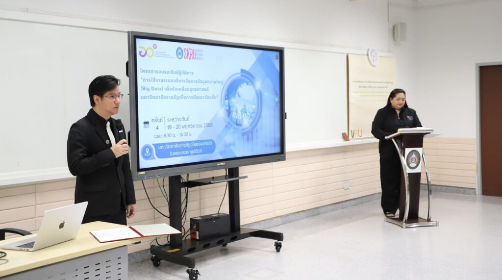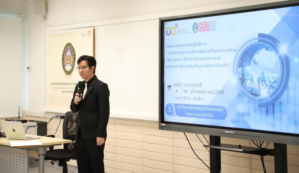 ผศ.พิเชษฐ์ จันทวี อธิการบดีมหาวิทยาลัยราชภัฏสงขลา (มรภ.สงขลา) มอบหมายให้บุคลากรกองนโยบายและแผน สำนักงานอธิการบดี มรภ.สงขลา ประกอบด้วย นางสโรชา บริสุทธิ์ หัวหน้างานคลังข้อมูลและอัตรากำลัง นางกฤชณัท พงศ์จันทรเสถียร และ น.ส.ศิริวิมล นวลศรี เจ้าหน้าที่บริหารงานทั่วไป จัดโครงการอบรมเชิงปฏิบัติการการใช้งานระบบบริหารจัดการข้อมูลขนาดใหญ่ (Big Data) เพื่อขับเคลื่อนยุทธศาสตร์มหาวิทยาลัยราชภัฏเพื่อการพัฒนาท้องถิ่น ครั้งที่ 4 ระหว่างวันที่ 19-20 พฤศจิกายน 2568 ณ อาคารเรียนรวมสังคมศาสตร์ มหาวิทยาลัยราชภัฏวไลยอลงกรณ์ ในพระบรมราชูปถัมภ์ (มรภ.วไลยอลงกรณ์ฯ) โดย รศ.ดร.สมบัติ คชสิทธิ์ อธิการบดี มรภ.วไลยอลงกรณ์ฯ ได้มอบหมายให้ ผศ.ดร.ภิศักดิ์ กัลยาณมิตร รองอธิการบดี เป็นประธานในพิธีเปิด