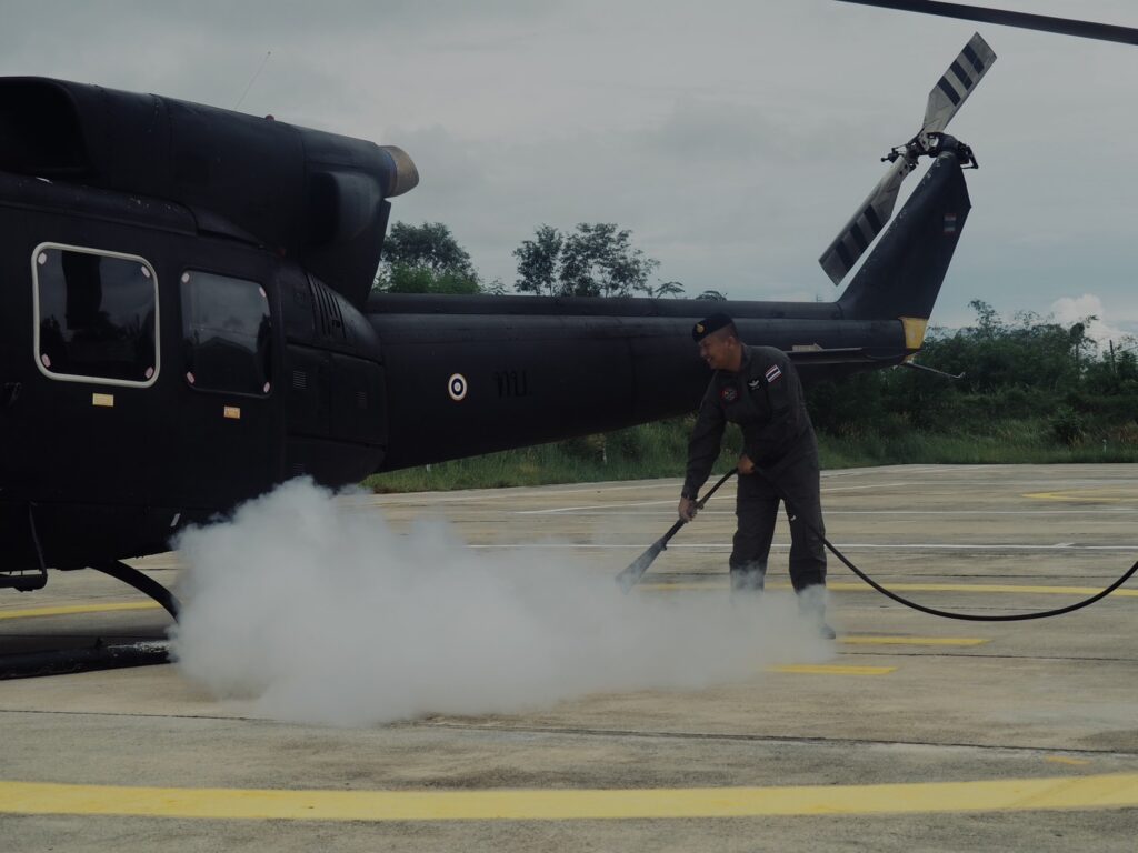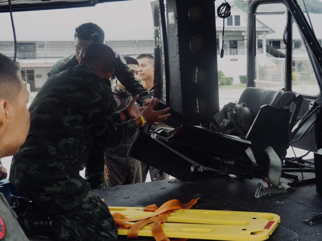 • อบรมขั้นตอนการเข้า–ออกอากาศยานอย่างปลอดภัย รวมถึงระบบไฟฟ้าและระบบน้ำมันของเฮลิคอปเตอร์ ฮ.ท.212