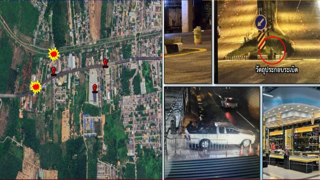 📝 เจ้าหน้าที่ตรวจพบวัตถุต้องสงสัยคล้ายระเบิดแสวงเครื่อง บริเวณจุดกลับรถหน้าห้างบิ๊กซี รวมทั้ง ตะปูเรือใบ วางตามถนนหลายจุด ซึ่งคาดว่าถูกใช้เพื่อสกัดการติดตามของเจ้าหน้าที่ เบื้องต้นได้ปิดกั้นพื้นที่และประสานหน่วยเก็บกู้วัตถุระเบิด (EOD) เข้าดำเนินการอย่างเร่งด่วน