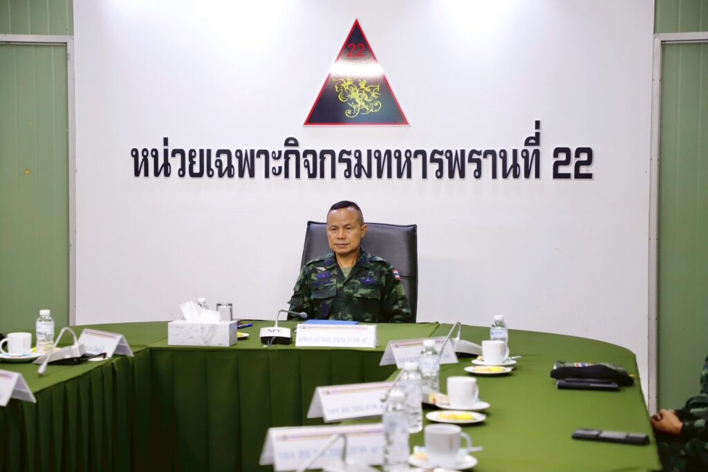 วันนี้ (9 พฤศจิกายน 2568) เวลา 11.30 น. พลโท นรธิป โพยนอก แม่ทัพภาคที่ 4/ผู้อำนวยการรักษาความมั่นคงภายในภาค 4 พร้อมด้วย พลตรี ชาคริต อุจะรัตน รองแม่ทัพภาคที่ 4/ รองผู้อำนวยการรักษาความมั่นคงภายในภาค 4 ส่วนหน้า และ พลตรี กฤศ ศรีเดชาสินธุ์ รองผู้อำนวยการรักษาความมั่นคงภายในภาค 4 ส่วนหน้า พร้อมคณะฯ ลงพื้นที่ตรวจเยี่ยมการปฏิบัติงานของหน่วยเฉพาะกิจกรมทหารพรานที่ 22 ตำบลเมาะมาวี อำเภอยะรัง จังหวัดปัตตานี เพื่อรับฟังผลการปฏิบัติงานสำคัญ และมอบนโยบาย 8 กิจสำคัญให้เป็นกรอบแนวทางในการปฏิบัติ พร้อมสร้างขวัญกำลังใจแก่กำลังพลผู้ปฏิบัติหน้าที่ โดยมี พันเอก อุเทน จีนทองหลาง ผู้บังคับหน่วยเฉพาะกิจกรมทหารพรานที่ 22 , ผู้บังคับกองร้อยฯ พร้อมด้วยกำลังพล ร่วมให้การต้อนรับและเข้าร่วมประชุมฯ