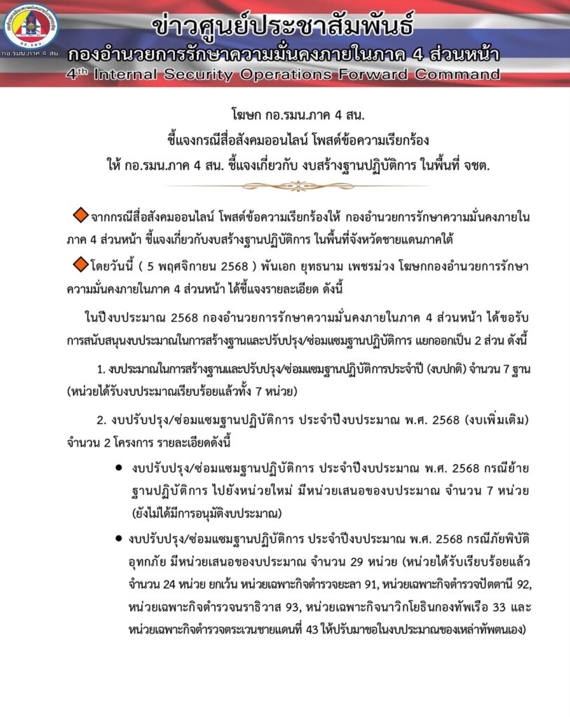 จากกรณีสื่อสังคมออนไลน์ โพสต์ข้อความเรียกร้องให้ กองอำนวยการรักษาความมั่นคงภายในภาค 4 ส่วนหน้า ชี้แจงเกี่ยวกับงบสร้างฐานปฏิบัติการ ในพื้นที่จังหวัดชายแดนภาคใต้