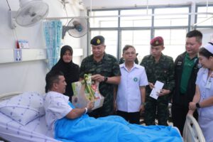 มทภ.4 เยี่ยมผู้บาดเจ็บจากเหตุคนร้ายขว้างระเบิดไปป์บอมบ์ใส่ฐานปฏิบัติการชุดคุ้มครองตำบลโต๊ะเด็ง ขณะเจ้าหน้าที่ รปภ. พื้นที่รับผิดชอบ พร้อมนำความห่วงใยจากผู้บังคับบัญชาไปยังเจ้าหน้าที่ทุกนาย ย้ำทุกภาคส่วนต้องบูรณาการทำงานให้รัดกุมยิ่งขึ้น