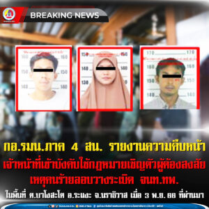 กอ.รมน.ภาค 4 สน. รายงานความคืบหน้า เจ้าหน้าที่เข้าบังคับใช้กฎหมายเชิญตัวผู้ต้องสงสัย เหตุคนร้ายลอบวางระเบิด จนท.ทพ. ในพื้นที่ ต.บาโงสะโต อ.ระแงะ จ.นราธิวาส เมื่อ 3 พ.ย.66 ที่ผ่านมา