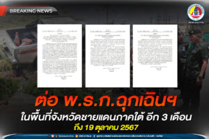ต่อ พ.ร.ก.ฉุกเฉินฯ ในพื้นที่จังหวัดชายแดนภาคใต้ อีก 3 เดือน ตั้งแต่ 20 กรกฎาคม 2567 ถึง 19 ตุลาคม 2567