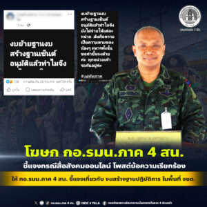 โฆษก กอ.รมน.ภาค 4 สน. ชี้แจงกรณีสื่อสังคมออนไลน์ โพสต์ข้อความเรียกร้องให้ กอ.รมน.ภาค 4 สน. ชี้แจงเกี่ยวกับ งบสร้างฐานปฏิบัติการ ในพื้นที่ จชต.