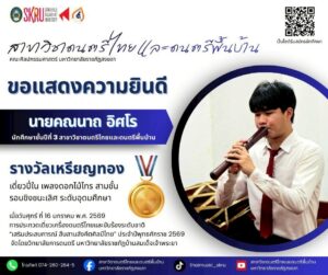 สุดเจ๋ง ! นศ. “ดนตรีไทยและดนตรีพื้นบ้าน” มรภ.สงขลา คว้า 3 เหรียญทอง 1 เหรียญเงิน ประกวดเดี่ยวเครื่องดนตรีไทยและขับร้องระดับชาติ “เสริมประสบการณ์ สืบสานสังคีตศิลป์ไทย” ปี 2569