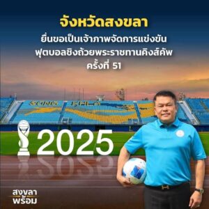 “สงขลา พร้อม” เสนอตัวเป็นเจ้าภาพจัดการแข่งขันฟุตบอลชิงถ้วยพระราชทานคิงส์คัพ ครั้งที่ 51 หลังประสบความสำเร็จอย่างสูงจากการเป็นเจ้าภาพเมื่อปีที่ผ่านมา