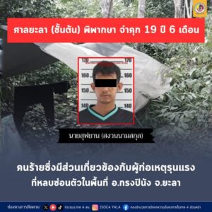 ศาลยะลา (ชั้นต้น) พิพากษา จำคุก 19 ปี 6 เดือน คนร้ายซึ่งมีส่วนเกี่ยวข้องกับผู้ก่อเหตุรุนแรงที่หลบซ่อนตัวในพื้นที่ อ.กรงปินัง จ.ยะลา