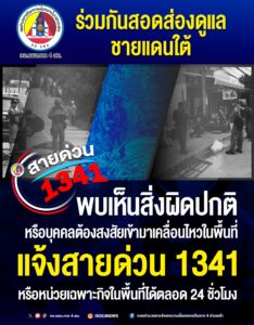 ร่วมกันสอดส่องดูแลพื้นที่ชายแดนใต้ พบเห็นสิ่งผิดปกติหรือบุคคลต้องสงสัยเข้ามาเคลื่อนไหวในพื้นที่