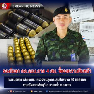 รองโฆษก กอ.รมน.ภาค 4 สน. ชี้แจงความคืบหน้า กรณีบริษัทขนส่งเอกชน ตรวจพบลูกกระสุนปืนขนาด 40 มิลลิเมตร ขณะคัดแยกพัสดุ ที่อำเภอบางกล่ำ จังหวัดสงขลา