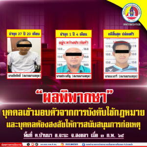 ผลพิพากษาบุคคลเข้ามอบตัวจากการบังคับใช้กฎหมายและบุคคลต้องสงสัยให้การสนับสนุนการก่อเหตุ พื้นที่ ต.น้านนา อ.จะนะ จ.สงขลา เมื่อวันที่ 3 ก.พ. 65