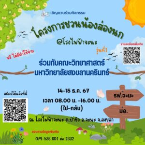 โรงไฟฟ้าจะนะ ร่วมกับ คณะวิทยาศาสตร์มหาวิทยาลัยสงขลานครินทร์ ขอเชิญชวนเยาวชนในพื้นที่อำเภอจะนะ เข้าร่วมโครงการ “ชวนน้องส่องนก @โรงไฟฟ้าจะนะ รุ่นที่ 1” ในวันที่ 14-15 ธันวาคม 2567 ณ โรงไฟฟ้าจะนะ โดยไม่มีค่าใช้จ่าย