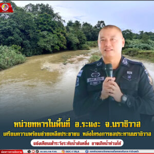 หน่วยทหารในพื้นที่ อ.ระแงะ จ.นราธิวาส เตรียมความพร้อมช่วยเหลือประชาชน หลังโครงการชลประทานนราธิวาส แจ้งเตือนเฝ้าระวังระดับน้ำล้นตลิ่ง อาจเกิดน้ำท่วมได้