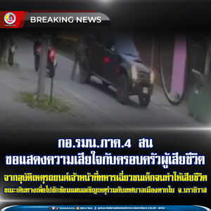 กอ.รมน.ภาค 4 สน. ขอแสดงความเสียใจกับครอบครัวของผู้เสียชีวิต จากอุบัติเหตุรถยนต์เจ้าหน้าที่ทหารเฉี่ยวชนเด็กจนทำให้เสียชีวิต ขณะเดินทางเพื่อไปซักซ้อมแผนเผชิญเหตุร่วมกับเทศบาลเมืองตากใบ จ.นราธิวาส