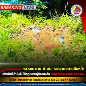 กอ.รมน.ภาค 4 สน. รายงานความคืบหน้า เจ้าหน้าที่เข้าบังคับใช้กฎหมายผู้ต้องสงสัย เหตุลอบวางระเบิด จนท.ทพ. ในพื้นที่ อำเภอศรีสาคร จังหวัดนราธิวาส เมื่อ 27 มิ.ย.67 ที่ผ่านมา
