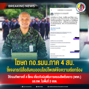 โฆษก กอ.รมน.ภาค 4 สน. ชี้แจงกรณีสื่อสังคมออนไลน์โพสต์ข้อความเรียกร้องให้กองทัพภาคที่ 4 ชี้แจงเกี่ยวกับเงินเพิ่มการครองชีพชั่วคราว (พชค.) อส.ทพ. ในพื้นที่ 3 จชต.