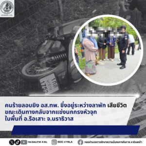 คนร้ายลอบยิง อส.ทพ. ซึ่งอยู่ระหว่างลาพัก เสียชีวิต ขณะเดินทางกลับจากแข่งนกกรงหัวจุก ในพื้นที่ อ.รือเสาะ จ.นราธิวาส
