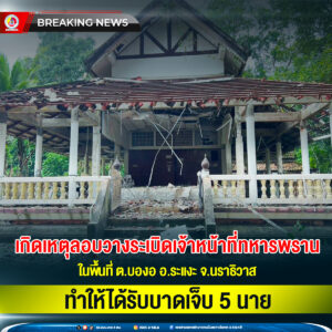 เกิดเหตุลอบวางระเบิดเจ้าหน้าที่ทหารพราน ในพื้นที่ ต.บองอ อ.ระแงะ จ.นราธิวาส ทำให้ได้รับบาดเจ็บ 5 นาย
