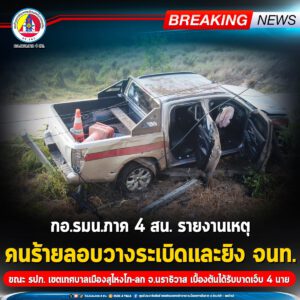 กอ.รมน.ภาค 4 สน. รายงานเหตุคนร้ายลอบวางระเบิดและยิง จนท. ขณะ รปภ.เขตเทศบาลเมืองสุไหงโก-ลก จ.นราธิวาส เบื้องต้นได้รับบาดเจ็บ 4 นาย