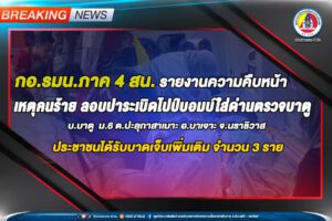 กอ.รมน.ภาค 4 สน. รายงานความคืบหน้าผู้ได้รับบาดเจ็บเพิ่มเติม เหตุคนร้ายลอบปาระเบิดไปป์บอมบ์ใส่ด่านตรวจบาตู บ.บาตู ม.6 ต.ปะลุกาสาเมาะ อ.บาเจาะ จ.นราธิวาส