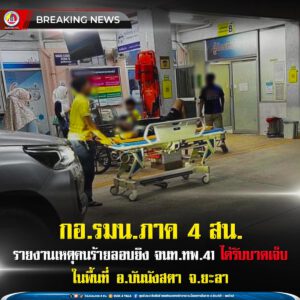 กอ.รมน.ภาค 4 สน. รายงานเหตุคนร้ายลอบยิง จนท.ทพ.41 ได้รับบาดเจ็บ บริเวณพื้นที่ อ.บันนังสตา จ.ยะลา