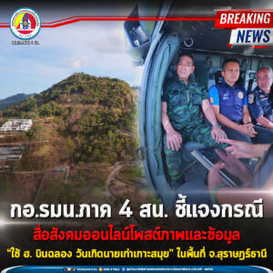 กอ.รมน.ภาค 4 สน. ชี้แจงกรณีสื่อสังคมออนไลน์โพสต์ภาพและข้อมูลกรณี “ใช้ ฮ. บินฉลอง วันเกิดนายเก่าเกาะสมุย” ในพื้นที่ จ.สุราษฎร์ธานี