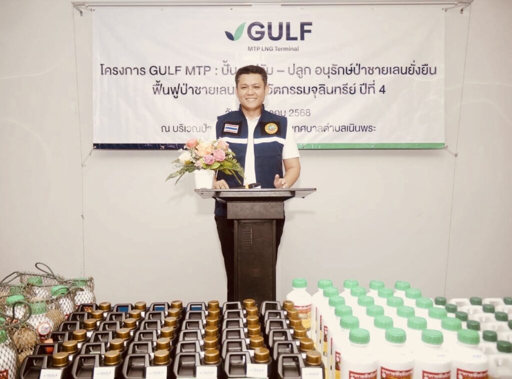 นายศุภฤกษณ์ โสภณราพงษ์ ผช.ผจก. GULF MTP กล่าวว่า บริษัท GULF MTP มีนโยบายชัดเจนและได้ริเริ่มโครงการฟื้นฟูป่าชายเลนด้วยจุลินทรีย์ ร่วมกับ วิสาหกิจชุมชนกลุ่มประมงเรือเล็กหาดสุชาดาฯ มาตั้งแต่ปี 2565 แม้ว่าจะประสบผลสำเร็จเป็นรูปธรรมในระดับหนึ่งอย่างชัดเจนก็ตาม บริษัทฯ จะส่งเสริมสนับสนุนชุมชนและร่วมมือกับเทศบาลเมืองเนินพระฯ ในการสานต่อให้สารถฟื้นฟื้นฟูระบบนิเวศน์ในพื้นที่นี้มากยิ่งขึ้นและเป็นที่มาในการจัดงานในวันนี้ เป็นการคลิกออฟ เริ่มต้นขับเคลื่อนโครงการฯฟื้นฟูป่าชายเลนด้วยจุลินทรีย์ ปีที่ 4 ร่วมกันต่อไปในปี 2569 ต่อเนื่อง ตลอดทั้งปี ครับ