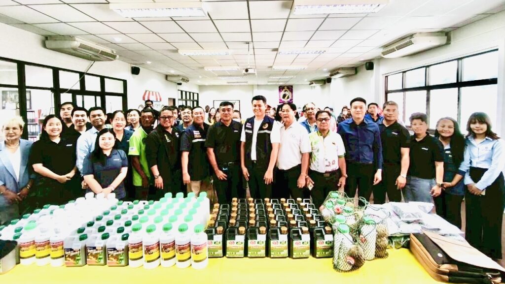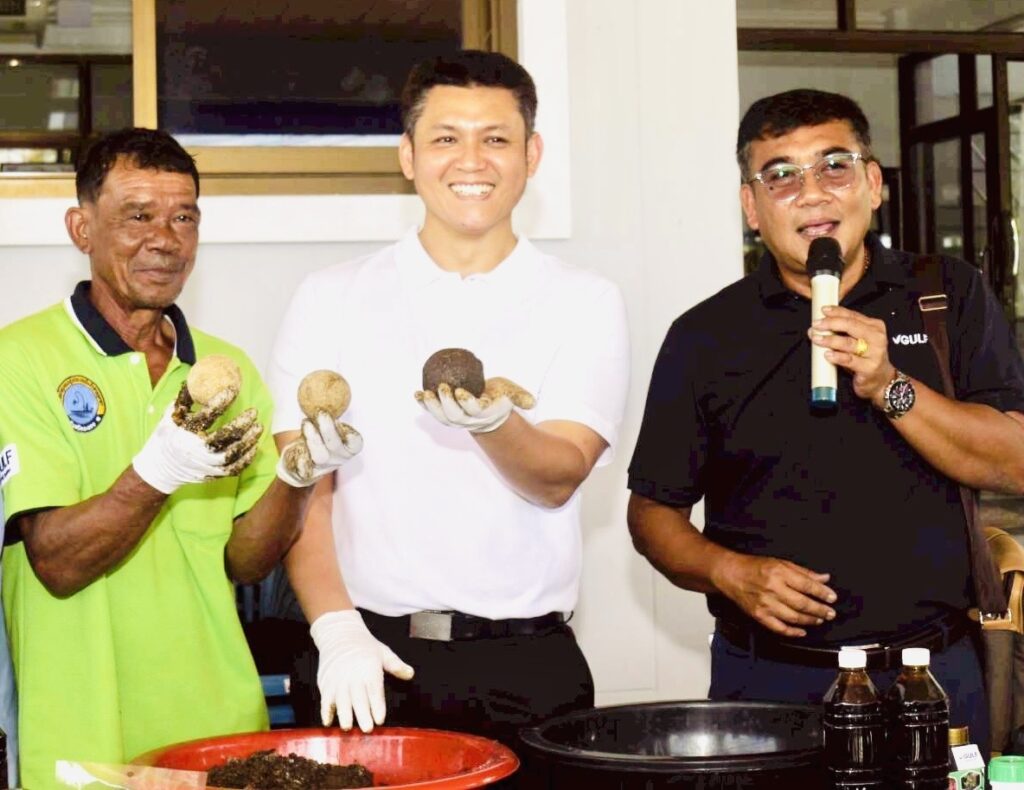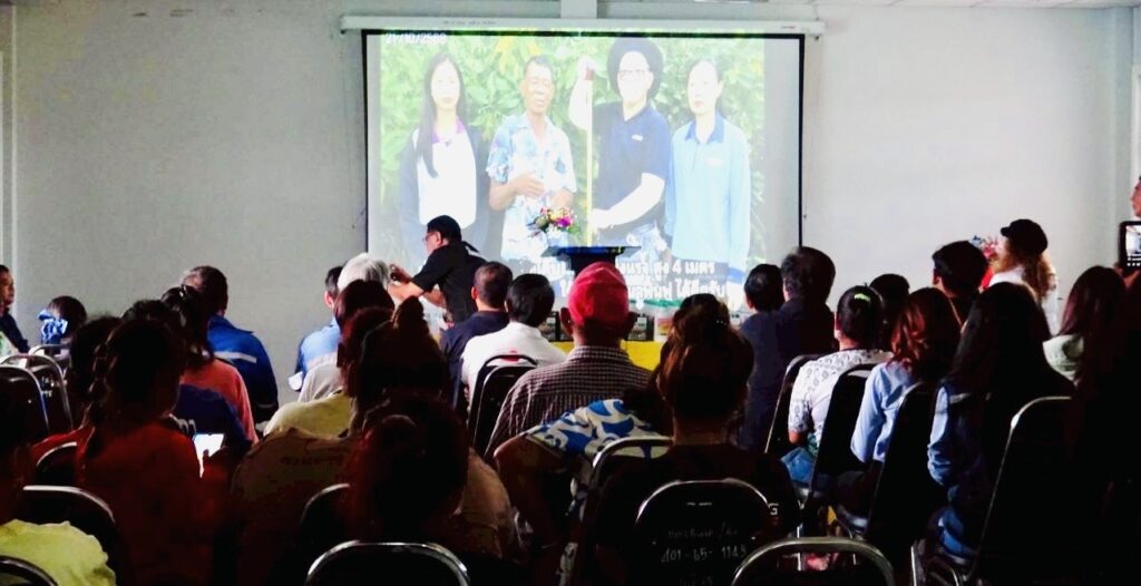 สำหรับกิจกรรมในวันนี้ มีการสรุปผลการติดตามประเมินผลการดำเนินงานโครงการฯที่ผ่านมา 3 ปี ตั้งแต่ ปี 2565 -2568 โดย ดร.กฤษณ์ พงษ์เทพิน (GULF) ได้กล่าวรายงานผลการติดตามพื้นที่ป่าชายที่ที่ได้ร่วมกันฟื้นฟูฯตั้งแต่ปี 2565 ผลดำเนินการมากว่า 3 ปี ที่ผ่านมา พบว่ามีความสำเร็จเกิดขึ้น ดังนี้ 1) สามารถพื้นฟูพื้นที่ป่าชายเลนที่เสื่อมโทรมและไม่มีต้นไม้ป่าชายเลนขึ้นอยู่เลย โดยการปรับสภาพดินน้ำและเสริมธาตุอาหารกล้าไม้ที่ปลูก ด้วยจุลินทรีย์ รวมกว่า 2,000 ต้น ต้นกล้าไม้ที่ปลูก มีอัตราการรอดสูง กว่า 80-90 % และเติบโตจากเริ่มปลูกสูง 50 เซนติเมตร สูงขึ้นเป็น 4 เมตร และด้านกายภาพสังเกตได้ว่ามีการเปลี่ยนแปลงในเชิงบวก คือ มีการเแตกของรากหลัก กิ่งก้าน ลำต้นขยายมากขึ้นสังเกตว่ามีการแทงรากแข็งแรงค้ำลำต้นมากขึ้นด้วยเติบโตแข็งแรงเป็นส่วนใหญ่ กว่า 80 % โดยประมาณ ซึ่งคณะผู้เข้าร่วมกิจกรรมในวันนี้ได้ร่วมติดตามและนำจุลินทรีย์ก้อนและจุลินทรีย์ชนิดน้ำ ไปร่วมกันใส่ในบริเวณแปลงฟื้นฟูร่วมกัน ด้วย 2) ด้านความเข้มแข็งของชุมชน มีการส่งเสริมวิสาหกิจชุมชนกลุ่มประมงเรือเล็กหาดสุชาดา อบรมความรู้ด้านจุลินทรีย์ชีวภาพ และ จัดตั้งศูนย์เรียนรู้และธนาคารจุลินทรีย์ชุมชนผลิตจุลินทรีย์รูปแบบต่างๆใช้ฟื้นฟูระบบนิเวศป่าชายเลน ต้นกล้าป่าชายเลน การนำไปใช้ทางการเกษตร ครัวเรือน ฯลฯ และเกิดผลสำเร็จด้านเศรษฐกิจชุมชน โดยชุมชนสามารถนำความรู้มาพัฒนาสินค้าชุมชน ผลิตภัณฑ์จากจุลินทรีย์ชีวภาพ เช่น ปุ๋ยหมัก ปุ๋ยน้ำชีวภาพ ฮอล์โมนปลาทะเลหมัก จุลินทรีย์ก้อน ฯลฯ เกิดการสร้างรายได้แก่ชุมชนแล้วด้วย ซึ่งจะเป็นกลไกการพัฒนาที่ขับเคลื่อนเศรษฐกิจ และสิ่งแวดล้อมควบคู่กันอย่างมีประสทธิภาพมากยิ่งขึ้นได้ต่อไป